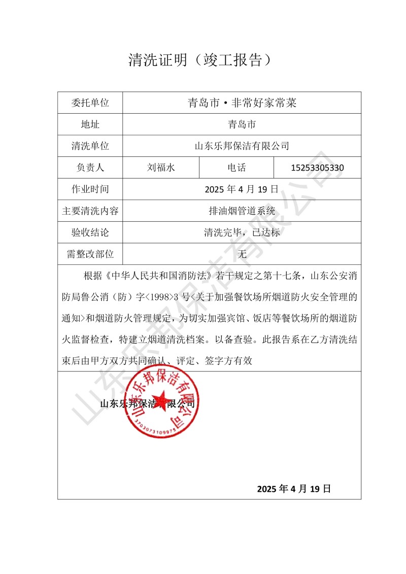 青島市·非常好家常菜清洗報告25.4.19