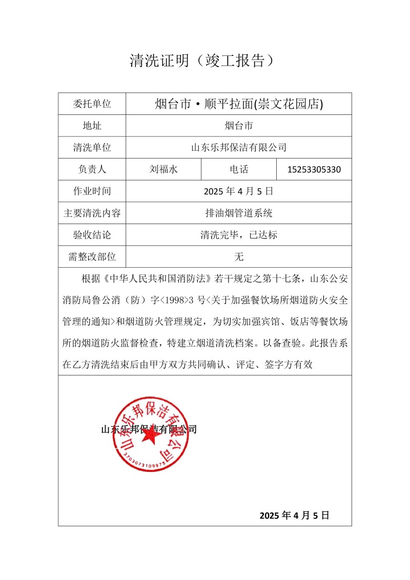 煙臺市·順平拉面(崇文花園店)清洗報告25.4.5