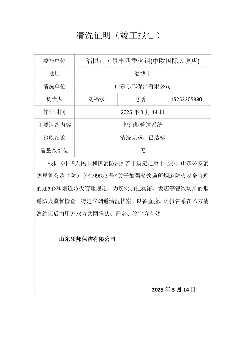 淄博市·景豐四季火鍋(中歐國際大廈店)清洗報告25.3.14