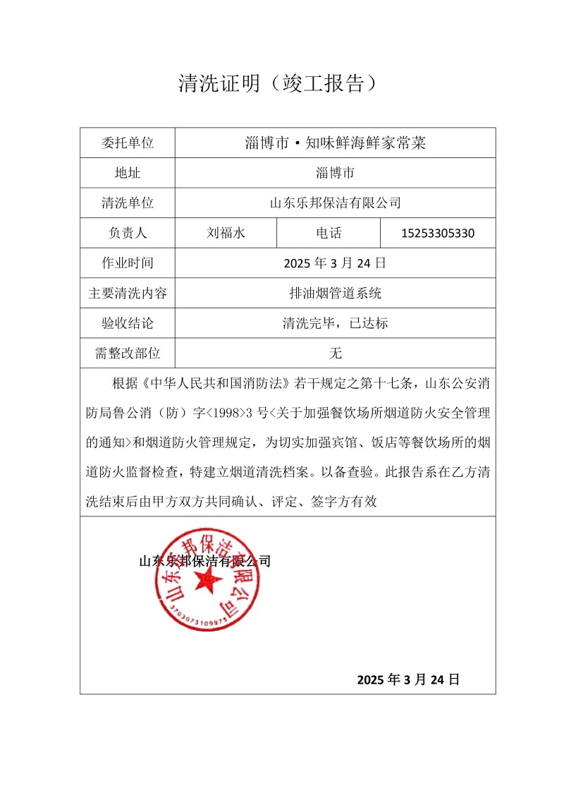 淄博市·知味鮮海鮮家常菜清洗報告25.3.23