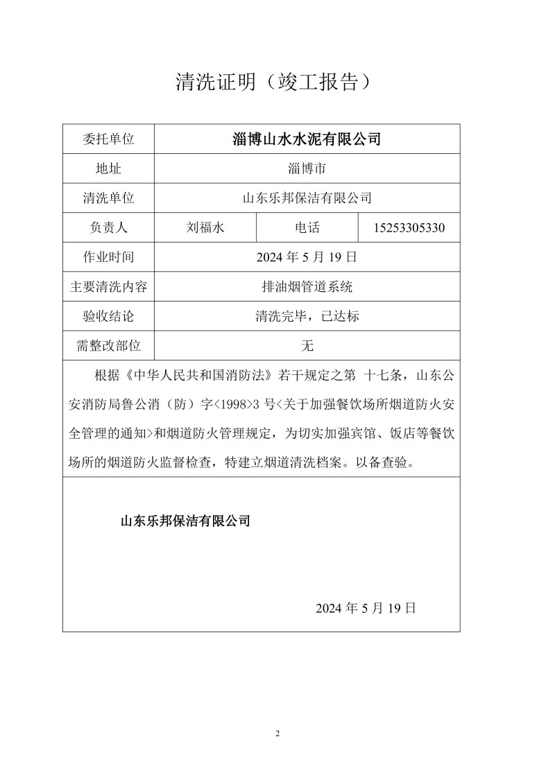 淄博山水水泥有限公司清洗報告24.5.19