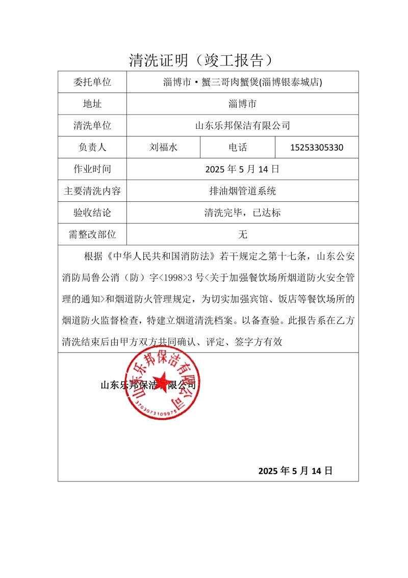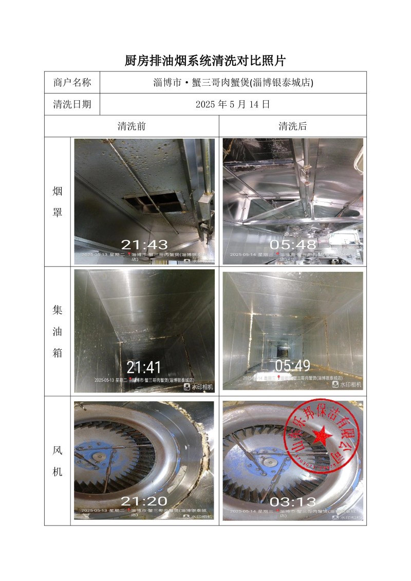 淄博市·蟹三哥肉蟹煲(淄博銀泰城店)清洗報告25.5.14