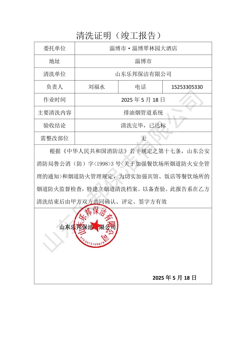 淄博市·淄博翠林園大酒店清洗報告25.5.18